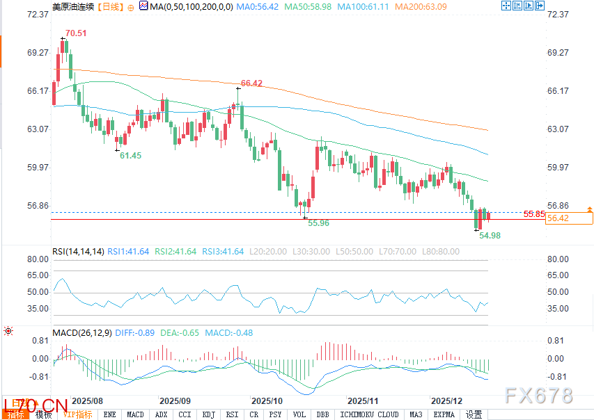 不过,从摆动指标走势来看,原油市场主趋势仍处于下行通道,且50日均线位于59美元附近。市场预计,若油价上行触及该区间,卖盘力量或将再度涌现。若油价失守55.85美元支撑位,则可能再度回落至本周低点54.84美元。