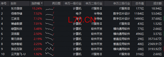 成份股方面,东方国信领涨超15%,佰维存储、江波龙、博睿数据涨逾7%,绿盟科技、深信服、普元信息、地纬智能、致远互联等个股跟涨。