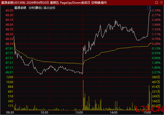 星源卓镁尾盘亦直线拉升,收盘大涨3.19%。