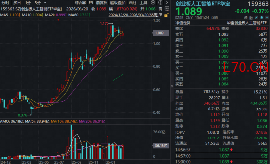 热门ETF方面,同类规模最大的创业板人工智能ETF华宝(159363)早盘一度冲高逾3%,受IDC算力租赁概念股闪崩影响,午后回落微跌0.37%,单日成交8.71亿元。单周来看,创业板人工智能ETF华宝(159363)逆市录得上涨周线斩获两连阳。