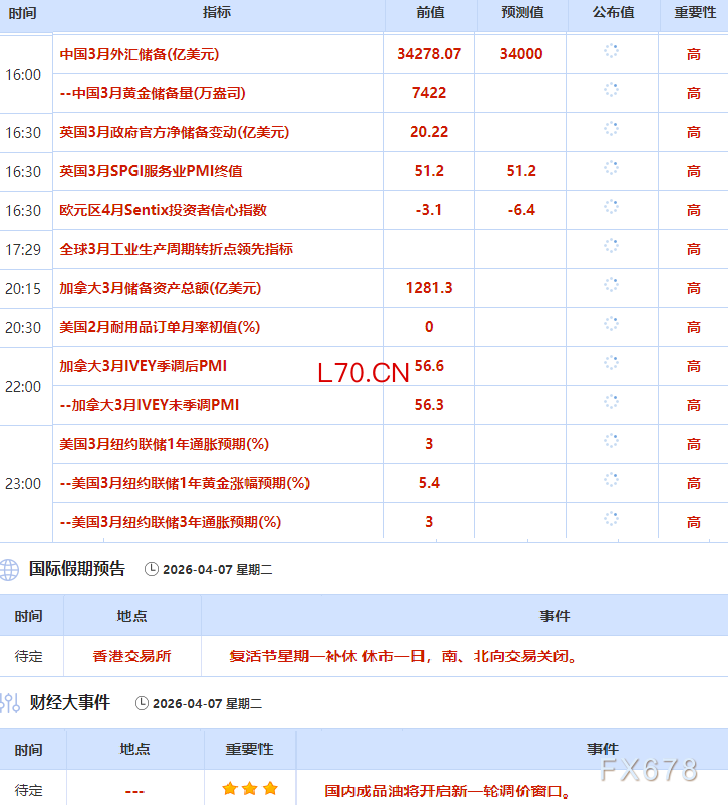周二(北京时间4月7日)亚市早盘,现货黄金交投于4660美元/盎司附近,金价周一小幅走低,尽管特朗普再度若周二前未能达成协议,将让伊朗“尝到地狱般的滋味”,但伊朗寻求持久停火方案并抵制临时停火压力,同时,伊朗抛出十点和平路线图,以解除封锁换取停战;美原油交投于112.76美元/桶附近,油价周一在震荡交投中上涨,市场聚焦假期归来,对上周五非农延后反应以及关注伊朗局势最新进展,特朗普称可4小时摧毁伊朗桥梁发电厂。