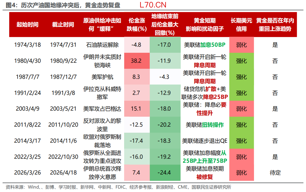 其一,只要美元信用弱化环境不变,地缘冲突引发金价回撤超过或接近20%,黄金或具较高赔率。以1974年、2003年、2022年美元信用弱化阶段为例,即使短期黄金因货币政策收紧等利空大幅回撤,黄金有望年内重新回归“上涨趋势”。与之相反的是,熊市虽然短期回撤幅度较小,但是“钝刀割肉”下的持续阴跌需要及时撤退(参考1980年、1991年、2011年、2014年等美元信用强化阶段)。