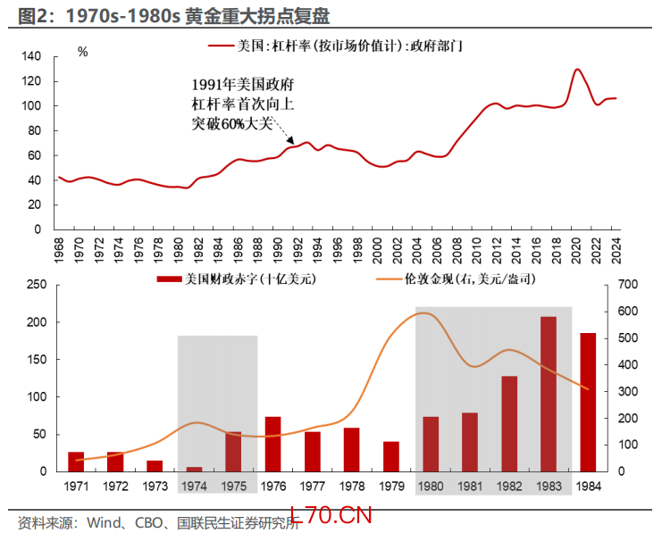 1971年以来,黄金趋势牛转熊大概率伴随着美元信用的“强化”或“重塑”。我们在《央行抛售黄金影响几何》报告将“1991年以前美国政府杠杆率低于60%的宽财政”视为“债务良性扩张”,“1991年以后美国政府杠杆率高于60%的紧财政”视为“财政赤字削减”,两者均对应“美元信用强化”。因此1975年福特政府减税、1980s里根政府减税、2011年奥巴马政府“财政悬崖”均视为“美元信用强化”,以上美元信用强化阶段均对应黄金的趋势性走熊。