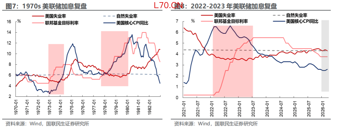 其三,当前黄金对货币政策定价偏鹰,未来有望向鸽派的方向修复。参考1970s和2022年,美联储加息的前提条件通常有两个:一是失业率的持续回落,二是通胀需求端的持续向好。回到当下,2026年3月美国失业率仍在自然失业率附近徘徊,通胀需求侧已经开始出现疲弱,美联储走向加息的难度较大,我们认为未来货币政策预期向鸽派方向修复有望助推黄金“收复失地”。