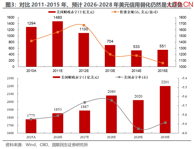 相比之下,2026年美元信用弱化的趋势并未“反转”,黄金趋势性拐点或尚未到来。参考2026年2月美国CBO预算报告,预计2026-2028年特朗普政府执政期间内美国财政赤字或向上突破2万亿美元大关,与2011年1月财政预期2012-2015年财政预算收紧形成“反差”。目前来看,我们认为美元信用走向强化至少需要民主党拿下参众两院并大幅修改《大而美法案》。