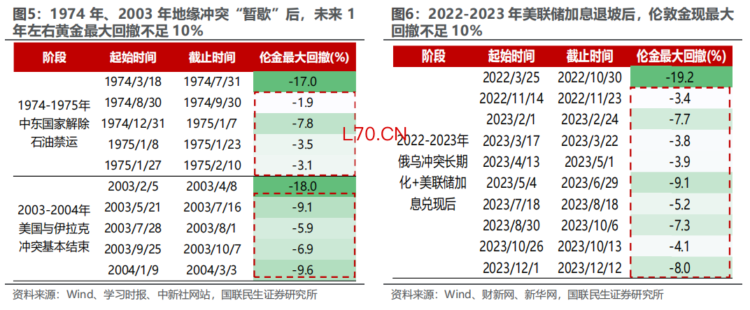 其二,美元信用弱化环境下,黄金经历接近20%回撤后,未来1年内最大回撤有望降低。对比1974-1975年、2003-2004年、2022-2023年,产油国地缘冲突前后伦敦金现回撤幅度接近或超过20%时,若未来1年内美元信用弱化前提不变,即使美联储货币收紧预期反复甚至加息(参考2004年和2023年),伦敦金现最大回撤超过10%的概率较低。