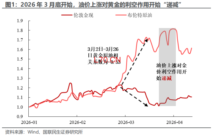 随着美伊冲突“螺旋”降温,短期黄金“至暗时刻”悄然过去,市场对黄金价格未来“何去何从”存在较大分歧。如图1所示,自2026年3月26日金价触底回升以来,油价“高位震荡”对黄金的利空作用开始边际递减。那么,黄金是重回上涨趋势还是走向新的“定价范式”?