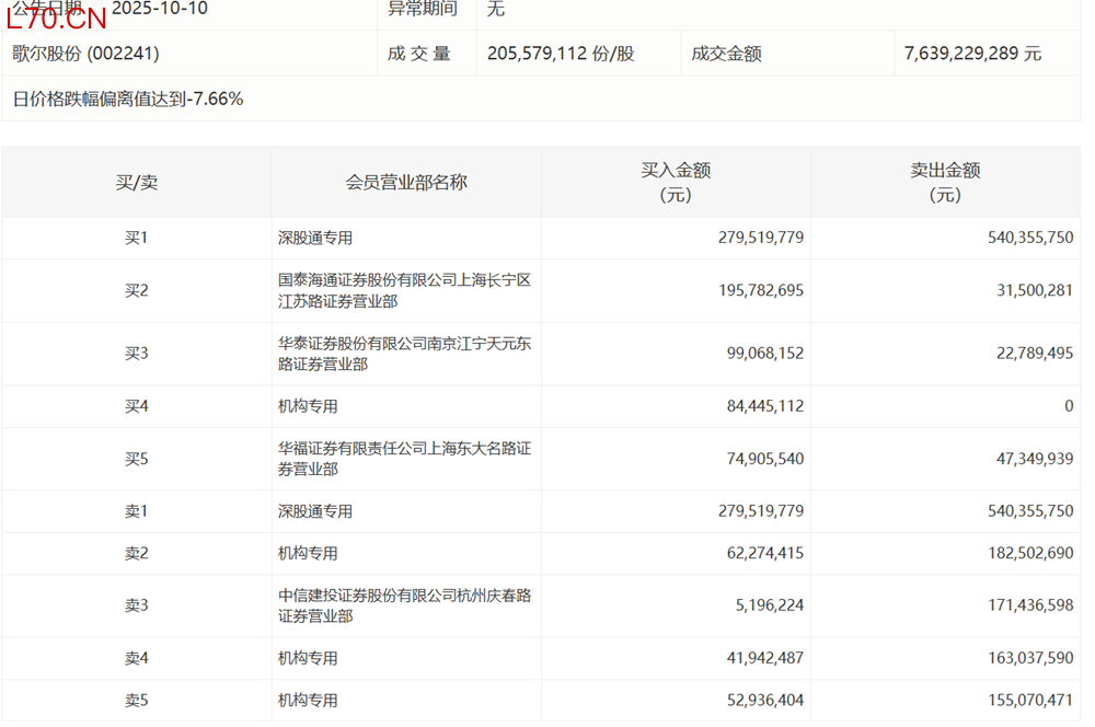 歌尔股份跌超9%,3家机构专用席位净卖出3.43亿元