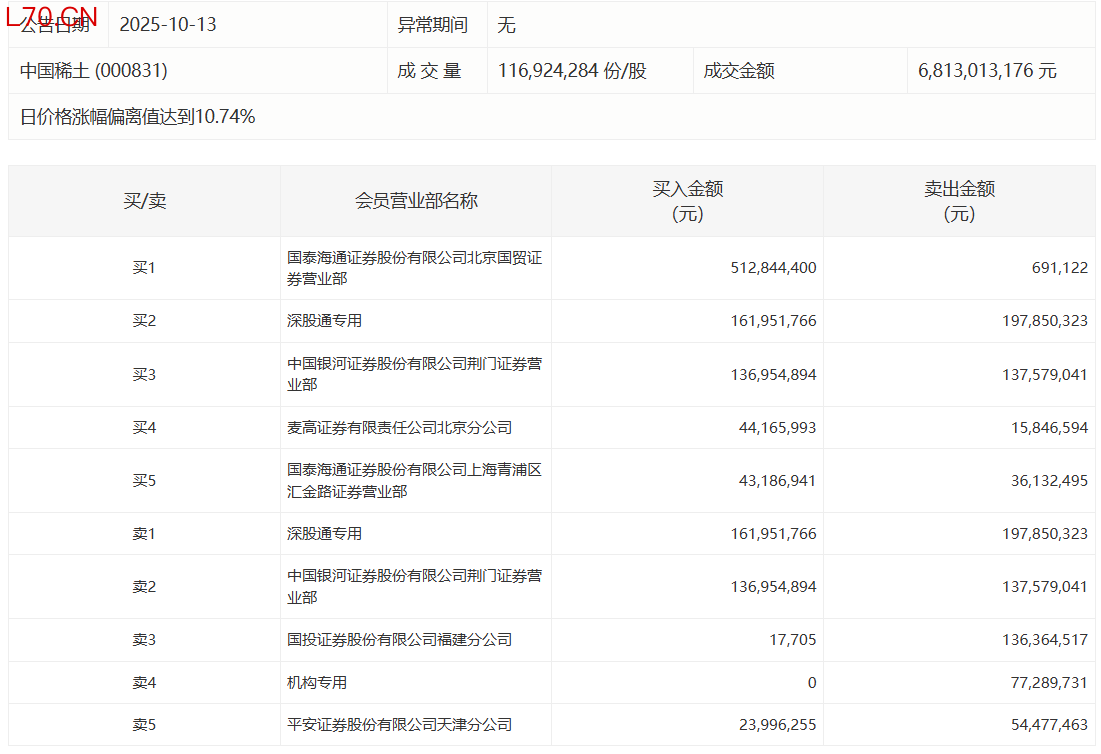 中国稀土今日涨停,国泰海通证券北京国贸营业部席位净买入5.12亿元