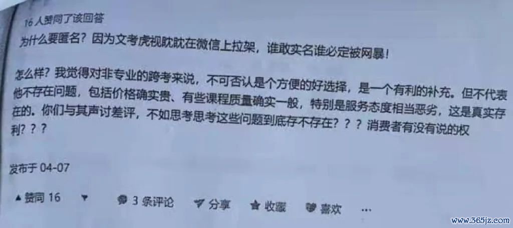 今年初有个新闻,说有个研究生在一家叫“文科考研网”上面报班上课,但体验不佳。于是就跑到了知乎留言区,匿名打了个差评,他提到: