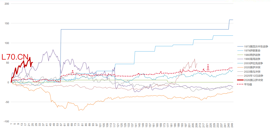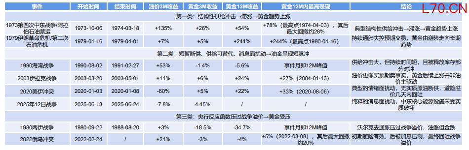 这份报告把1973年第四次中东战争/石油禁运、1979年伊朗革命危机、1980年两伊战争、1990年海湾战争、2003年伊拉克战争、2020年美伊冲突、2022年俄乌冲突、2025年“12日战争”等样本放在一张框架里复盘,最后归纳出三种常见“范式”:结构性供给冲击带来滞胀、黄金走趋势牛;断供短暂或可替代、油金只打一段脉冲;以及央行反应函数压过战争溢价、黄金反而受压。